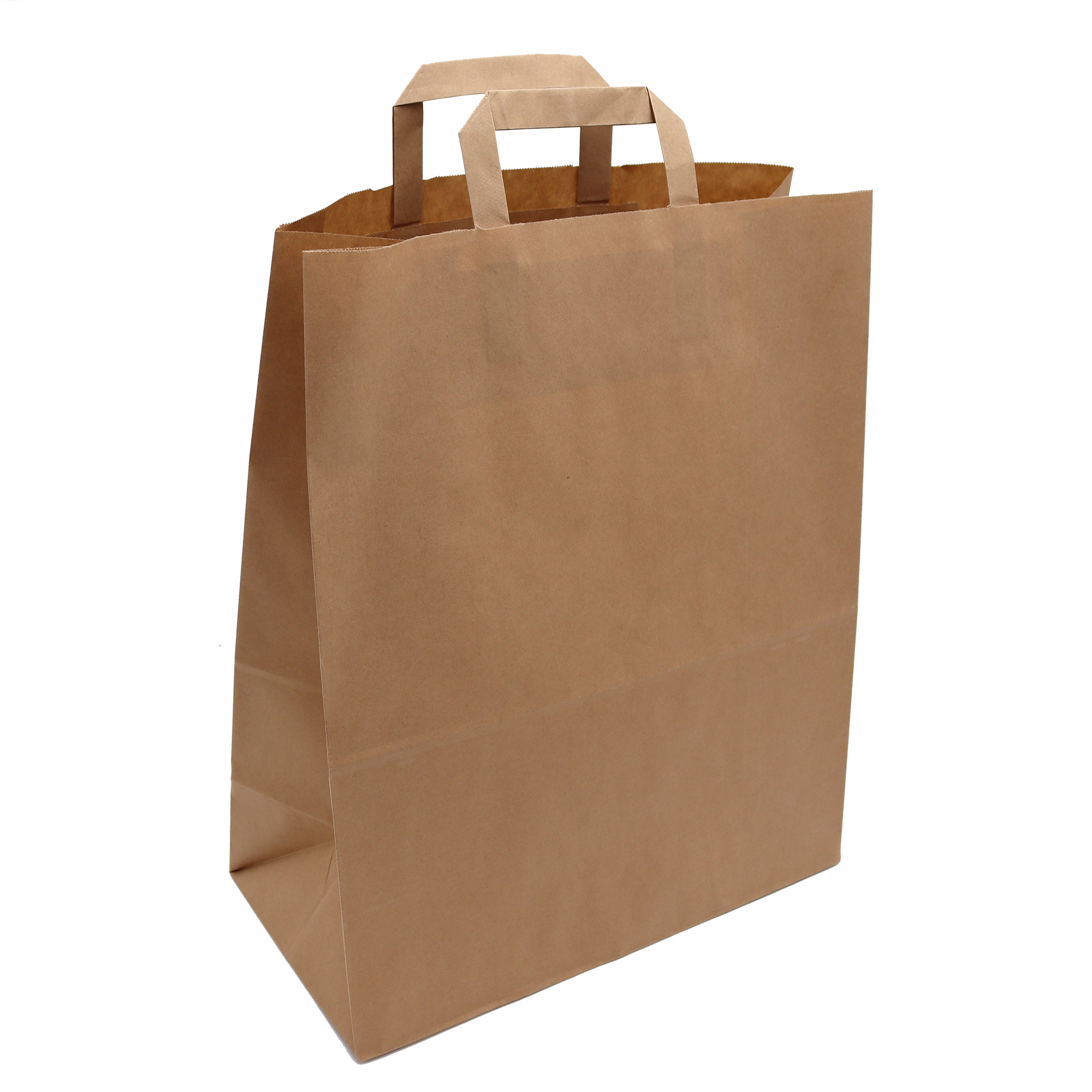 Brune papirposer med flate håndtak. Egner seg godt til butikker eller markeder. Posene rommer 30 liter og måler 32x16x45 cm. De er produsert i Sverige med 90gr FSC-sertifisert råmateriale og selges i kartonger med 200 stk.